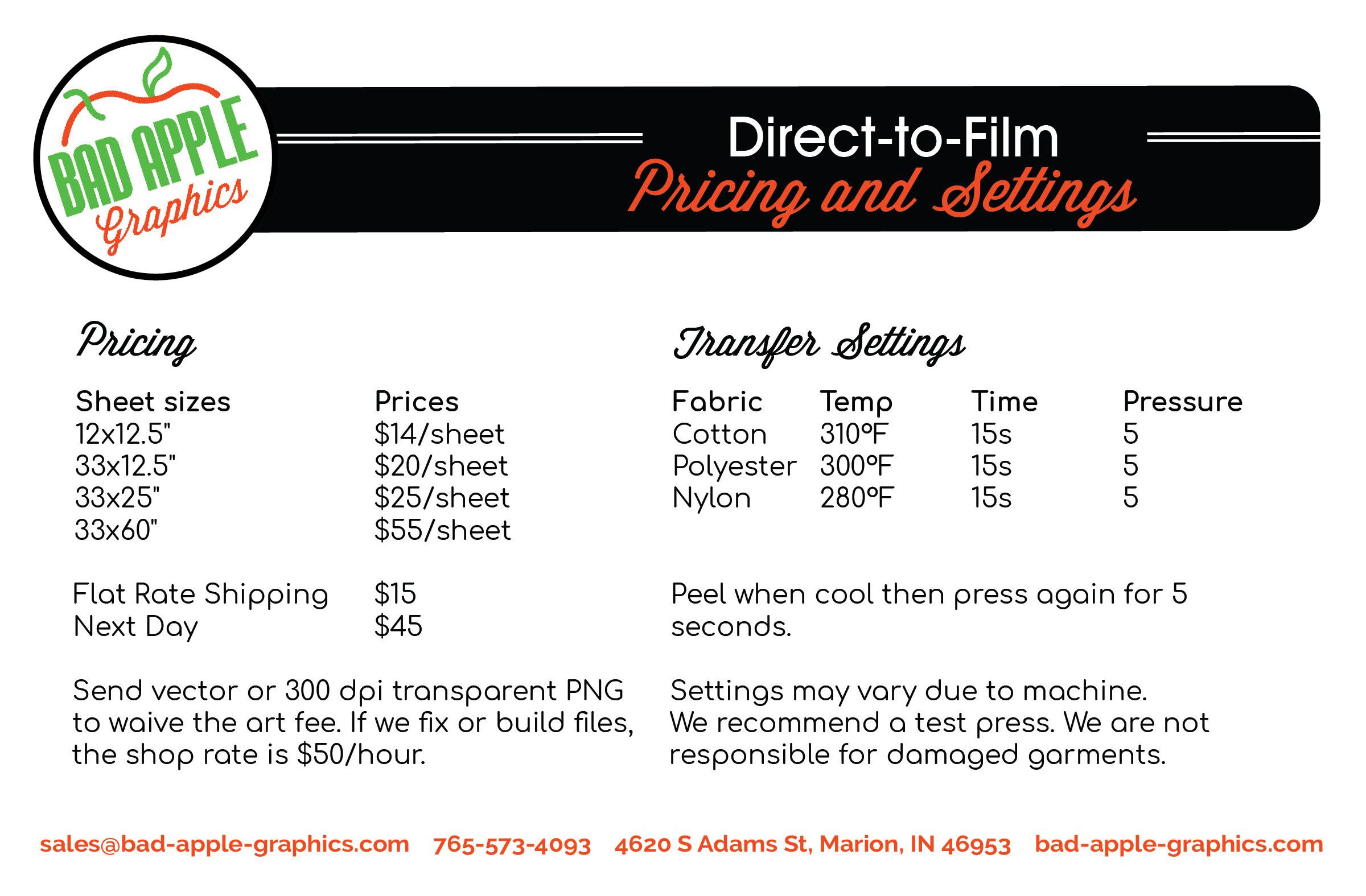 DTF (Direct To Film) transfers are a more recent addition to printed apparel. Transfers are printed digitally onto transfer film using textile pigment inks. An image is printed in reverse, then a powder adhesive is applied to the back of it either inline with the machine or manually. The transfers are then cut from the film individually and applied to the apparel using a heat fusion process.